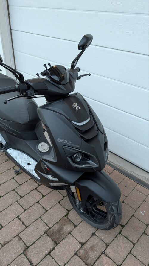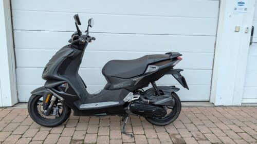Körkänslan är stabil och bekväm tack vare 12-tumshjul med aluminiumfälgar och halvslick-däck som ger bra grepp på vägen. Den hydrauliska fjädringen fram och bak gör att mopeden hanterar ojämnt underlag utan problem, och den generösa sadeln fungerar bra även vid längre körningar. För passagerare finns både handtag och fotstöd som gör färden trygg.